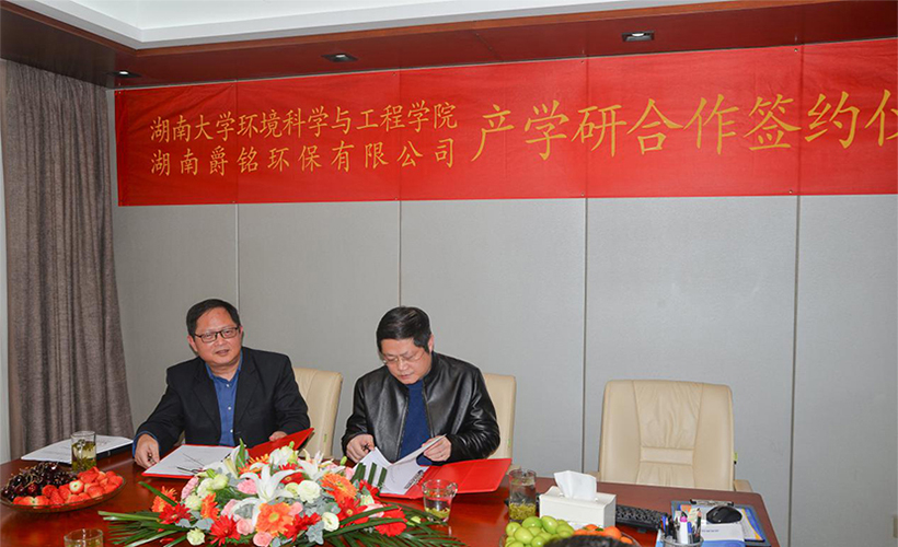 在熱烈的掌聲中,雙方進行了協議簽字儀式。譚果強總經理、張長副院長分別簽訂了產學研戰略合作協議。簽字儀式舉行后,湖南大學環境科學與工程學院張長副院長作出了重要講話,雙方合作的層次更高、力度更大,必然為學校各項事業的發展提供了更加堅實的基礎與條件。學校將緊緊依托企業發展,以人才的培養目標為引導,大力推進工程教育的發展,相信學校與湖南爵銘環保有限公司的深度合作一定會有更加美好的前景。